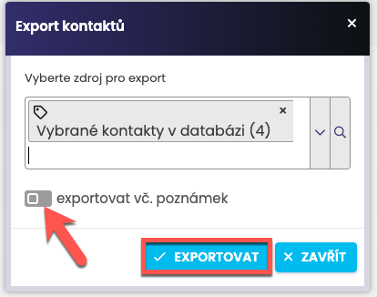 Zvolte, zda chcete export kontaktů vč. poznámek a potvrďte tlačítkem „Exportovat“. Stáhne se vám do počítače xlsx soubor „kontakty“.