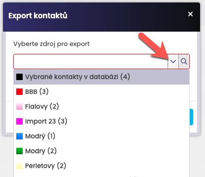 Vyberte kontakty, které si přejete vyexportovat > rozklikněte šipkou možnosti a zvolte buďto vybrané (vámi zaškrtnuté) kontakty v databázi nebo kontakty pod určitým štítkem.