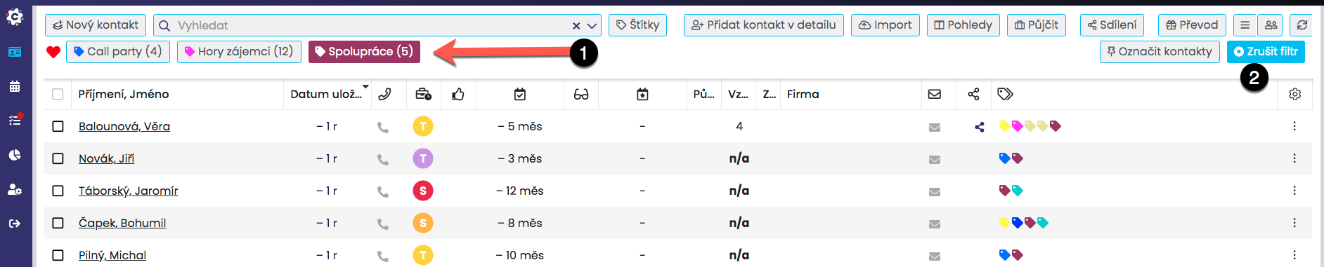 Kontakty označené štítky můžete v seznamu kontaktů snadno vyfiltrovat kliknutím na oblíbený štítek v horní liště (1) > zobrazí se vám pouze kontakty tohoto štítku. Zakliknout jich můžete i více najednou. Filtr pak zrušíte tlačítkem vpravo „Zrušit filtr“ (2).