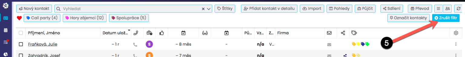 Zpět do zobrazení všech kontaktů se vrátíte zrušením označení štítku nebo kliknutím na Zrušit filtr (5).