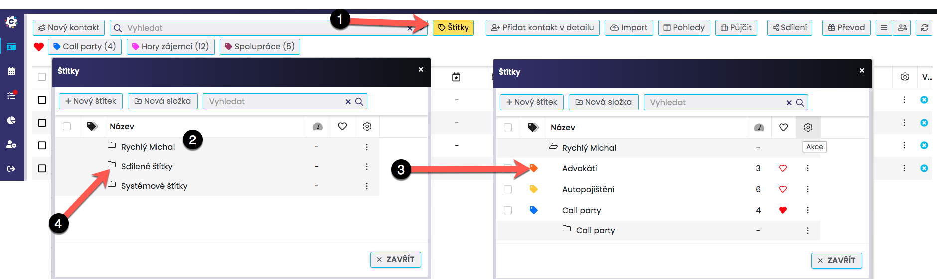 Kontakty označené štítkem (který není oblíbený) můžete jednoduše filtrovat kliknutím na Štítky (1). Klikněte na daný štítek v seznamu (2). Je možné také zaškrtnout (3) více štítků najednou > filtrovat (4) a tím se zobrazí všechny kontakty těmito štítky označené. Zobrazí se tak kontakty, které mají alespoň jeden z vybraných štítků.