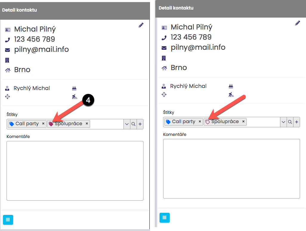 Štítek si do Oblíbených zařadíte i přes detail kontaktu, pokud kliknete na ikonu štítku (4) > vybarví se > to značí, že je v oblíbených. Pokud kliknete na ikonu znovu, štítek se „odvybarví“, tím ho z oblíbených odeberete.
