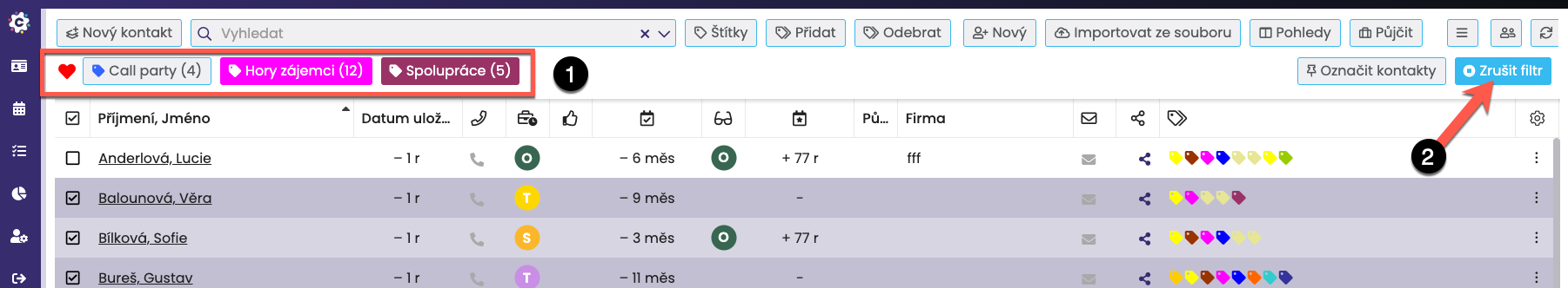 Pokud si chcete zobrazit kontakty z oblíbeného štítku, stačí na něj kliknout. Zvolený štítek se vybarví (1). Můžete vybrat i více štítků najednou. Pokud na vybraný štítek kliknete podruhé, výběr tím zrušíte.