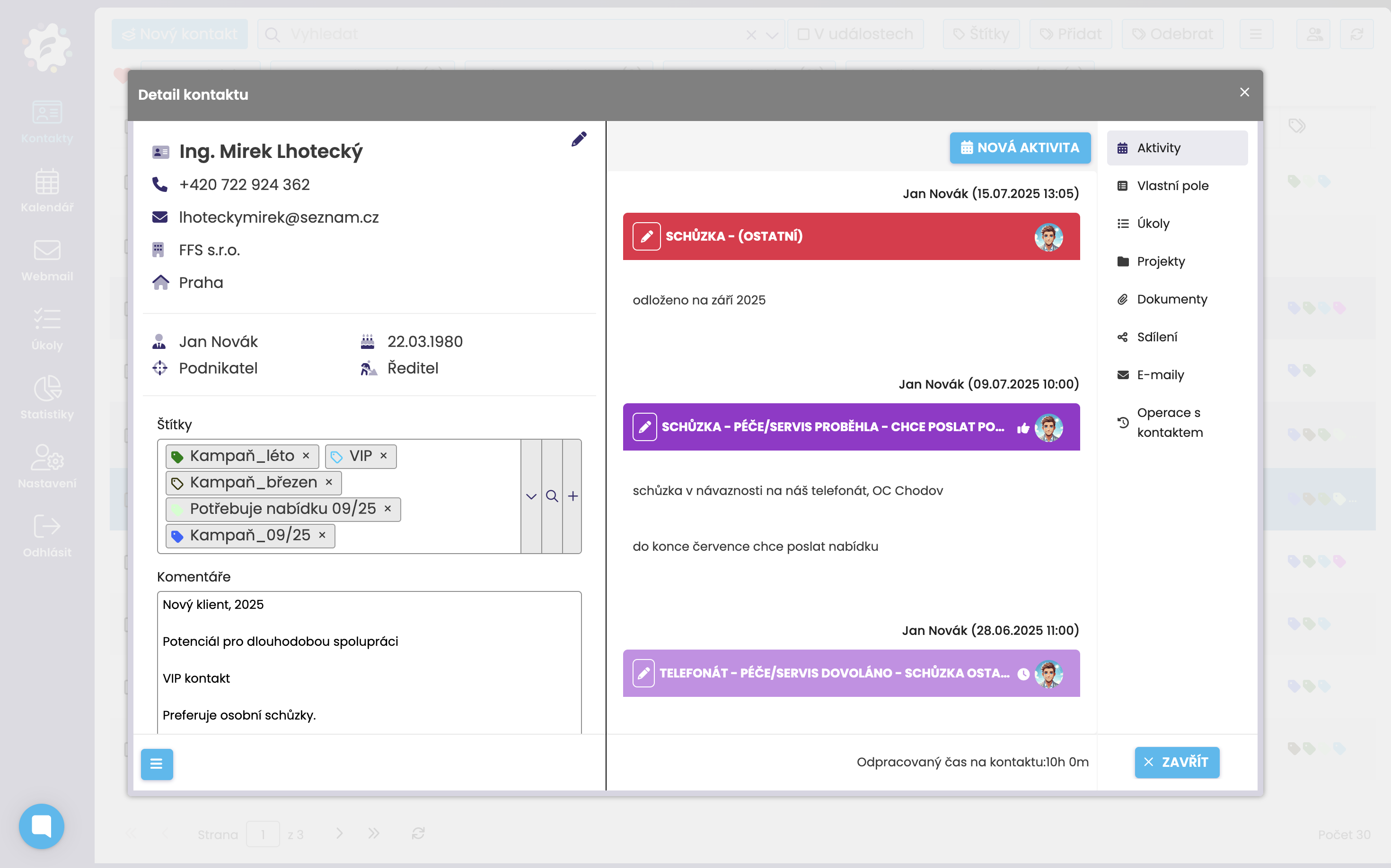 Jakákoliv aktivita, ať už se jedná o schůzku, hovor, či úkol, se vám automaticky připojí do karty kontaktu.
