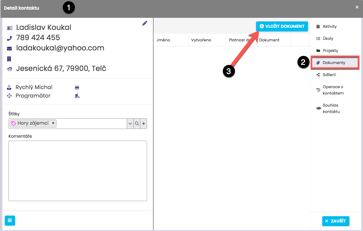 V modulu Kontakty si otevřete kartu daného kontaktu (1) a v kolonce Dokumenty (2) vložíte dokument (soubor) kliknutím na „Vložit dokument“ (3).