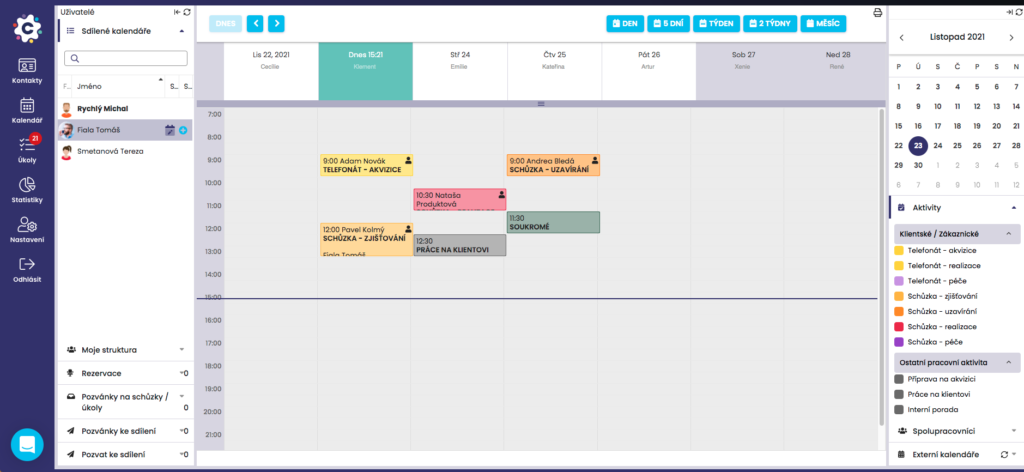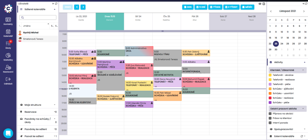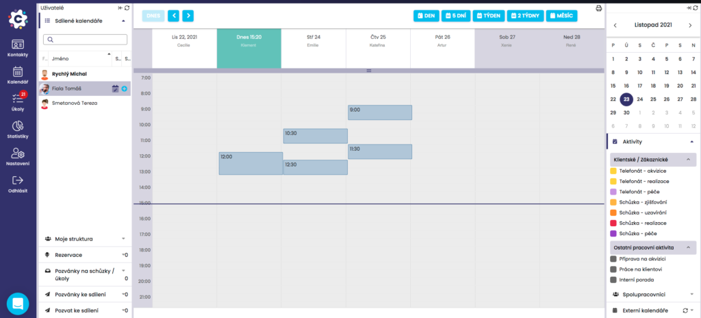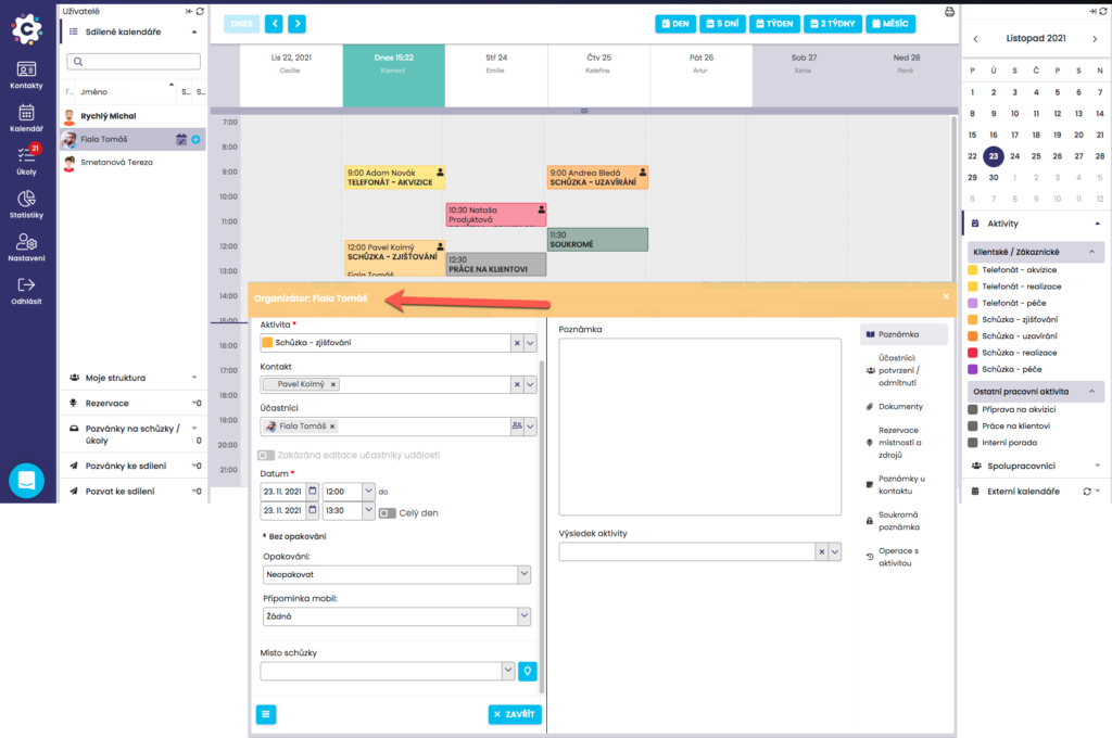 Viditelnost kalendáře je stejná jako při úrovni Podrobnosti aktivit, s tím rozdílem, že jde do kalendáře kolegovi zapsat novou aktivitu a editovat již vytvořené.