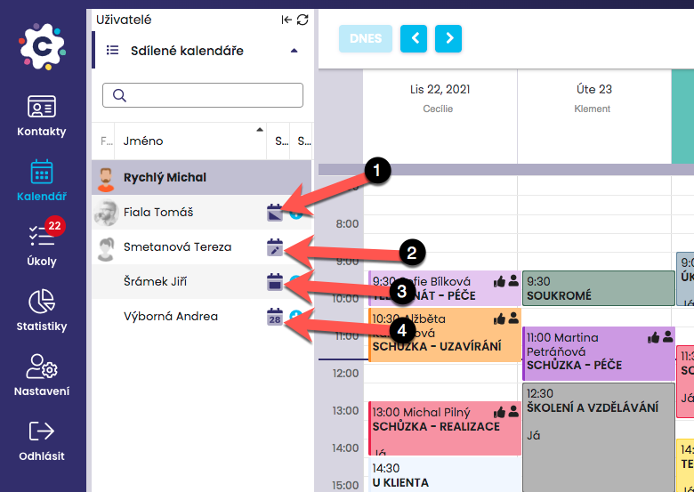 Kliknutím na jméno osoby v seznamu Sdílených kalendářů (4) se Vám zobrazí kalendář dané osoby v nastaveném typu sdílení.