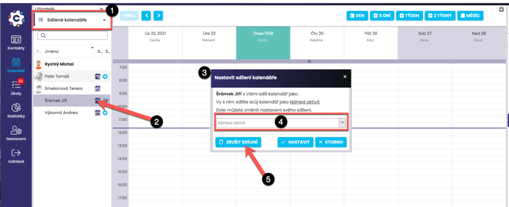 Můžete změnit jiný typ Sdílení kalendáře s danou osobou, tedy jak uvidí Váš kalendář (4) nebo sdílení zcela zrušit kliknutím na Zrušit sdílení (5). Při zrušení sdílení se sdílení zruší vzájemně, tedy Vy neuvidíte kalendář dané osoby a ona neuvidí Váš kalendář.