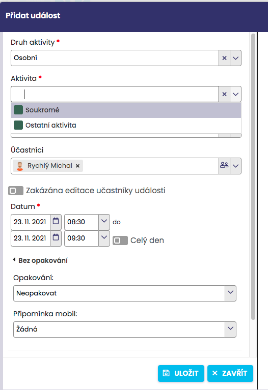 Druh aktivity Osobní nabízí možnosti Ostatní aktivita a Soukromé. Pokud zadáte aktivitu Soukromé, podrobnosti o těchto událostech jsou v Kalendáři viditelné pouze Vám, nikomu jinému (ani vašemu manažerovi). Pokud přidáte další Účastníky a zaškrtnete Povolit editaci aktivity pozvaným, pak pozvaní účastníci budou moci aktivitu editovat.