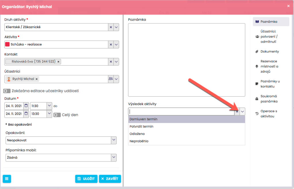Pro zadání výsledku aktivity klikněte na příslušnou aktivitu a vyberte odpovídající Výsledek aktivity.