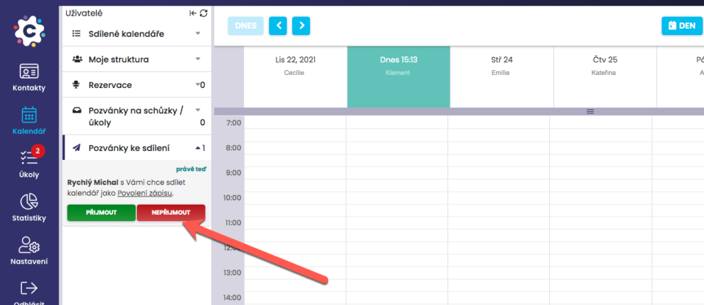 Pozvánku ke sdílení můžete odmítnout přímo ze záložky Pozvánky ke sdílení a sice kliknutím na NEPŘIJMOUT. Odmítnutím pozvánky se vzájemné sdílení neaktivuje, tudíž Vy neuvidíte kalendář osoby, která Vám Pozvánku poslala a ani ona neuvidí Váš kalendář.