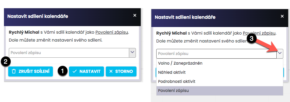 Pokud s takto navrhovaným vzájemným sdílením kalendáře nesouhlasíte, můžete vzájemné sdílení zcela odmítnout kliknutím na tlačítko Zrušit sdílení (2).