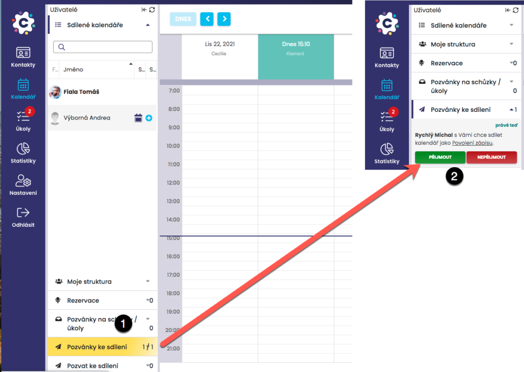 Informaci o tom, že jste obdržel Pozvánku ke sdílení kalendáře s Vaším kolegou/kolegyní naleznete v modulu kalendář v záložce Pozvánky ke sdílení (1). V Pozvánce (2) je detailně popsáno, kdo Vám Pozvánku ke sdílení posílá a jak s Vámi chce sdílet svůj kalendář.