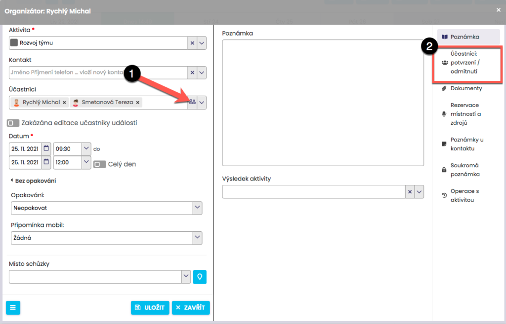 Pro dodatečné odmítnutí účasti na schůzce je potřeba ve vašem kalendáři rozkliknout příslušnou Aktivitu a kliknout na ikonku skupiny u Účastníků (1) nebo v pravém sloupici na Účastníci: potvrzení / odmítnutí (2).