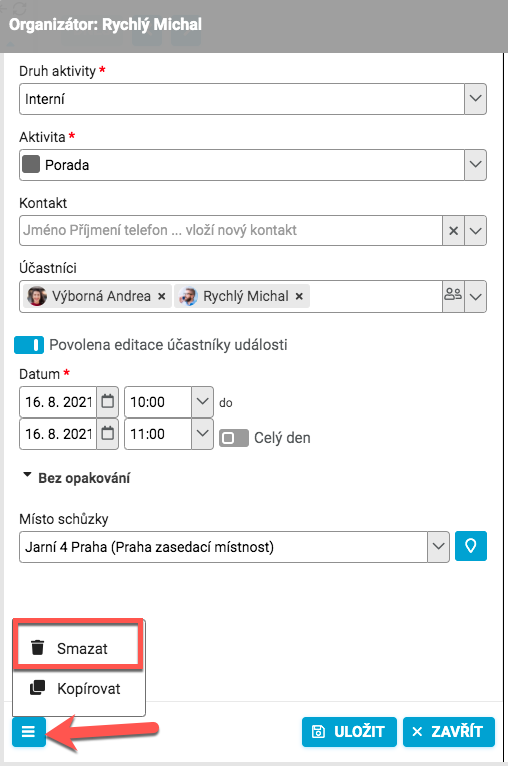 Schůzku může smazat organizátor v detailu aktivity kliknutím na ikonu vlevo dole a „Smazat“.