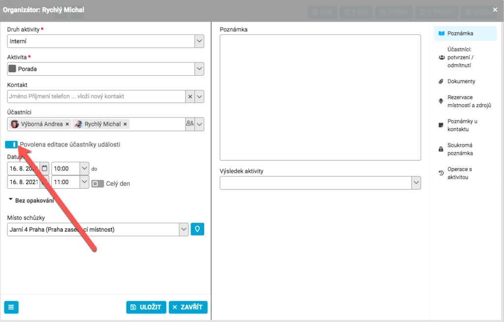 Kolegům můžete povolit editaci akivity zaškrtnutím kolonky Povolit editaci aktivity pozvaným účastníkům. Můžete tak aktivně pracovat v rámci týmu se zaslanými termíny, například změnou místa konání, připsáním poznámky nebo dokonce i změnou termínu. Všechny provedené změny jsou on-line aktualizovány všem účastníkům.