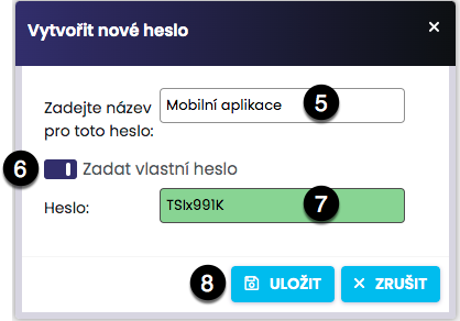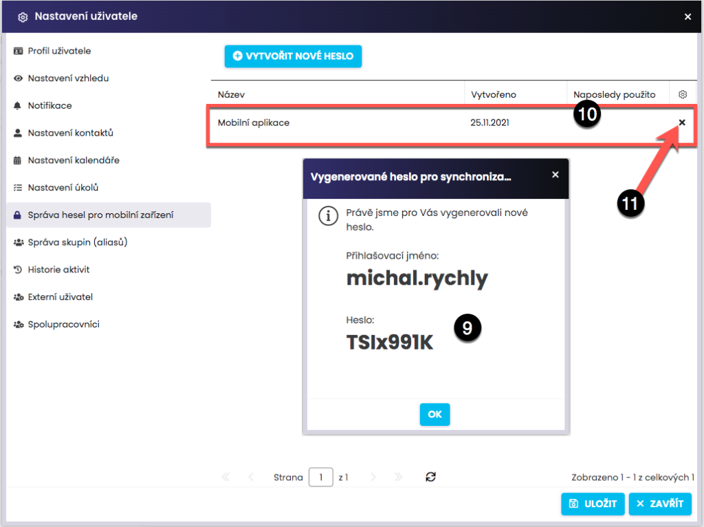Po kliknutí na Uložit se zobrazí okno s vygenerovaným nebo vlastním heslem (9), které si ponechte zobrazené, nebo si jej poznamenejte. Z bezpečnostních důvodů heslo po zavření okna (kliknutím na OK) nelze znovu zobrazit. Pokud budete synchronizovat více zařízení, můžete si vygenerovat pro každé zařízení nové heslo nebo použít jedno stejné. Všechna hesla, která máte v seznamu uložená (10), jsou aktivní.