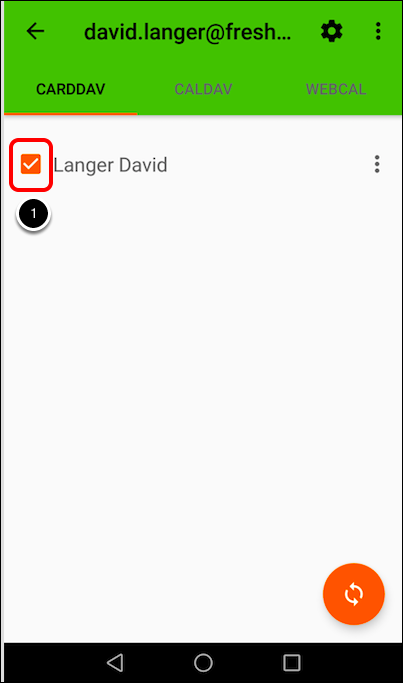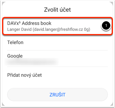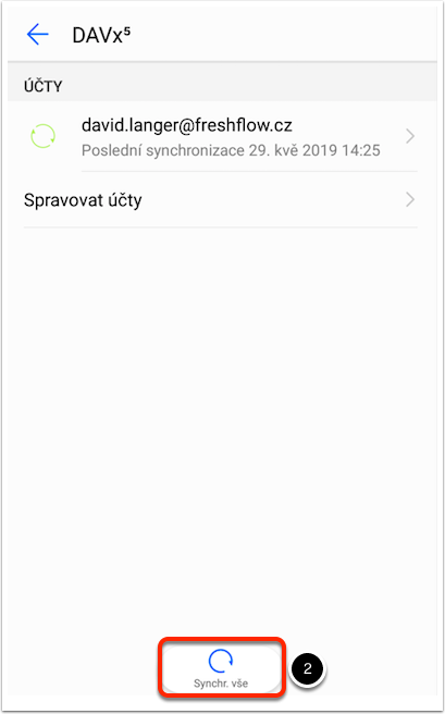 Pro okamžitou synchronizaci ťukněte na Synchr.vše (2). Kroky opakujte i pro DAVx⁵ Adress book.