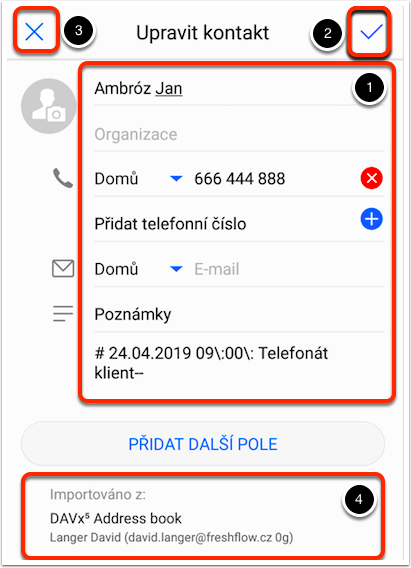 Otevřete ťuknutím kontakt, který si přejete editovat a ťukněte na Upravit. V okně Upravit kontakt změňte údaje (1), pro uložení změn ťukněte na OK (2). Pro zrušení změn ťukněte na X (3). Při editaci kontaktu vidíte informaci o DAVx⁵ Address book a název Vašeho účtu, což znamená, že je kontakt synchronizován s FreshFlow (4).