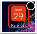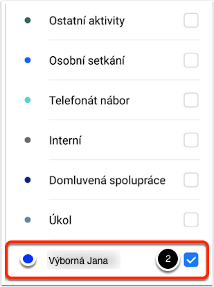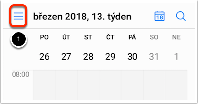 Kalendáře spolupracovníků vidíte v Kalendáři mobilního telefonu po kliknutí na Menu (tři vodorovné čárky v levo nahoře) (1) a zaškrtnutí kalendáře (2). Poté se Vám pod příslušnou barvou zobrazí kalendář spolupracovníka. Zde již není možnost barevného rozlišení aktivit. Jedná se pouze o jednobarevný náhled do tohoto kalendáře.