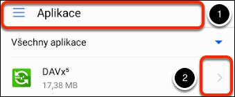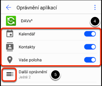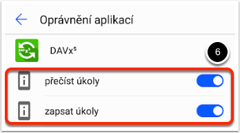 Po dokončení instalace aplikace DAVx⁵ proveďte kontrolu nastavení oprávnění aplikace. Ťukněte na Nastavení telefonu / tabletu a zde na Aplikace (1). Vyhledejte DAVx⁵ a ťukněte na ikonu šipky (2), dále ťukněte na ikonu šipky u Oprávnění (3). Zkontrolujte a případně povolte oprávnění pro Kalendář, Kontakty, příp. Vaše poloha (4), pak ťukněte na ikonu čárek u Další oprávnění (5) a zkontrolujte případně povolte oprávnění pro read tasks a write tasks (modul Úkoly FreshFlow) (6).