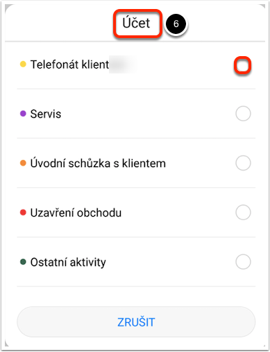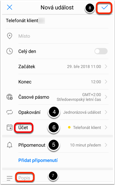 Při zadávání aktivit do kalendáře doporučujeme do Názvu (1) psát typ aktivity, například Telefonát klient. Dále můžete v doplnit místo (2), délku trvání aktivity (3). Po kliknutí na Další můžete vybrat z možností opakování aktivity (4), zda chcete, aby Vás Váš mobil upozornil na aktivitu (5). Nejdůležitější je VYBRAT SPRÁVNÝ KALENDÁŘ (6), do něhož aktivitu vložíte. Pokud chcete, aby aktivity byly barevně odlišeny, je potřeba pro danou aktivitu vybrat vždy příslušný kalendář. Tedy například pro Telefonát klientovi vyberte kalendář Telefonát klient, atd. Poté ještě můžete dopsat poznámku (Popis) k aktivitě (7) a potvrdit zadání aktivity ťuknutím na tlačítko OK (fajvka v pravo nahoře) (8).