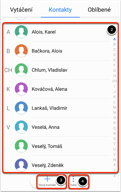 Otevřete si na Vašem telefonu Kontakty (1). V záložce Kontakty uvidíte Vaše kontakty (2). Ťuknutím na „+Nový kontakt“ přidáte kontakt (3). Ťuknete-li na „Další“ (4), pak v Předvolby zobrazení můžete vybrat zda chcete zobrazovat jen kontakty z FreshFlow (DAVx⁵ Address book) nebo i z telefonu, Googlu a dalších zdrojů.