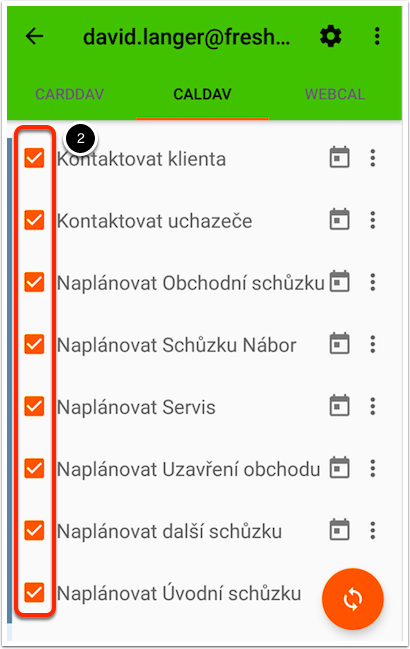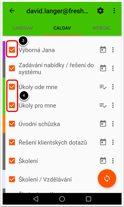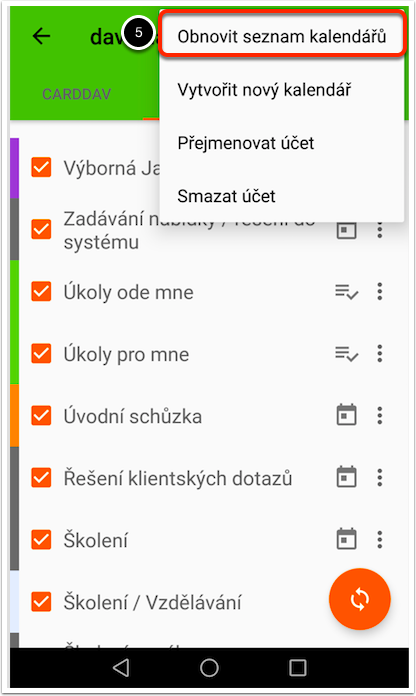 Jestliže kdykoliv později bude přidán nový kalendář v FreshFlow např. nová aktivita, pak ťukněte na menu (tři svislé tečky vpravo nahoře) v CALDAV, dále na Obnovit seznam kalendářů (5) a nový kalendář bude přidán do nabídky, jeho zaškrtnutím jej nastavíte k synchronizaci.