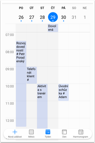 Po synchronizaci dat s FreshFlow se Vám v kalendáři zobrazí Vaše aktivity barevně, identicky s FreshFlow kalendářem. V menu Kalendáře zvolíte, které aktivity si přejete vidět (2), Novou aktivitu přidáte ťuknutím na „+Nová událost“ (3) nebo ťuknutím na volné místo v kalendáři.
