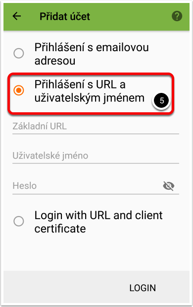 Vyberte volbu Přihlášení s URL a uživatelským jménem (5).