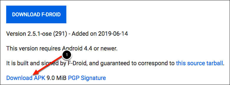 Po ťuknutí v mobilu / tabletu na odkaz v emailu nebo po zadání https://f-droid.org/en/packages/at.bitfire.davdroid/ do prohlížeče v mobilu / tabletu pokračujte ťuknutím na Download APK (1). Dále ťukněte na NAINSTALOVAT (2).