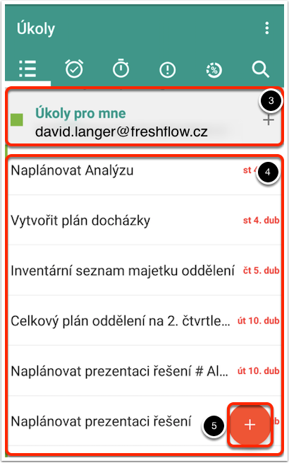 Po ťuknutí na aplikaci Úkoly (1) se Vám zobrazí Úkoly ode mne a Úkoly pro mne synchronizované s FreshFlow (2). Po ťuknutí například na Úkoly pro mne (3) se zobrazí Váš seznam úkolů (4). Ťuknutím na „+“ můžete zadat nový úkol (5).