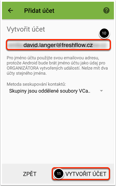 Po zobrazení této stránky zkontrolujte Vaší emailovou adresu (10), poté ťukněte na Vytvořit účet (11).