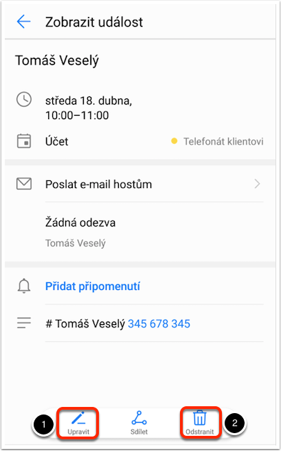 Po ťuknutí na aktivitu v Kalendáři se zobrazí detaily aktivity. Ťuknete-li na Upravit (1) můžete aktivitu editovat. Smazání aktivity provedete ťuknutím na Odstranit (2).