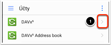 Pro manuální (okamžitou) obou strannou synchronizaci Kalendáře, Kontaktů a Úkolů s FreshFlow ťukněte na Nastavení (telefonu / tabletu) a pak na Účty. Zde ťukněte na šipku u DAVx⁵ (1).