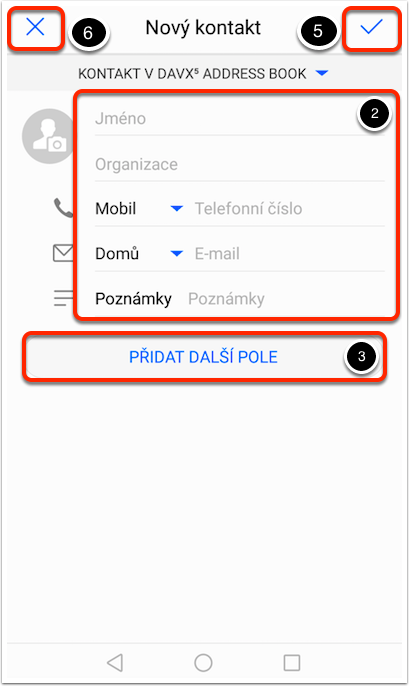 Po ťuknutí na „+Nový kontakt“ v nově otevřeném okně Zvolit účet ťukněte na DAVx⁵ Address book pro zadání kontaktu, který bude synchronizován do FreshFlow (1). V okně Nový kontakt VŽDY zadejte Jméno Příjmení a telefon (2). Po ťuknutí na Přidat další pole (3) můžete zadat Adresu, Přezdívku (např. senior, junior…) a dašlí údaje (4). Pro uložení nového kontaktu ťukněte na OK (ikona fajfky) (5). Pro zrušení zadání ťukněte na ikonu X (6).