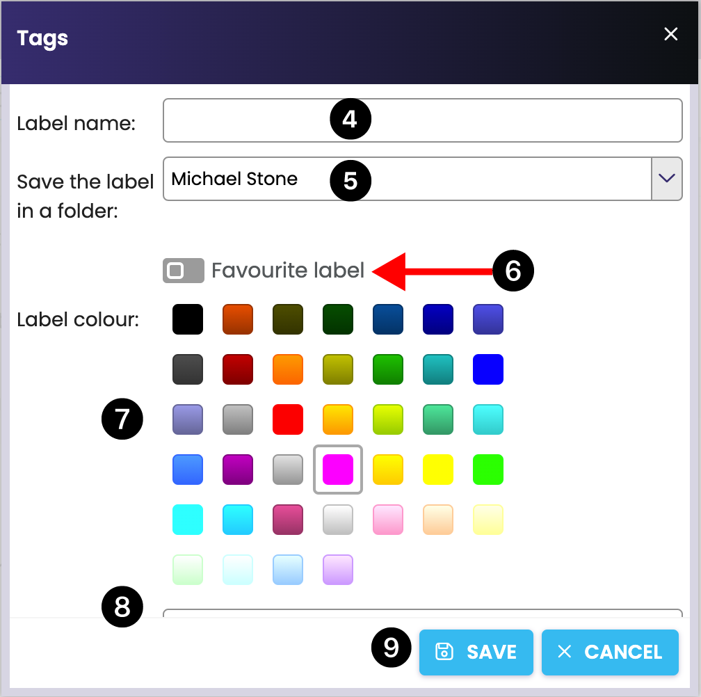 Next, select the color (7) you want. You can also enter a Note for the label (8). Clicking Save (9) will save your new label, and it’ll show up in the folder you picked, or on the main Contacts page (if you marked it as a favorite).