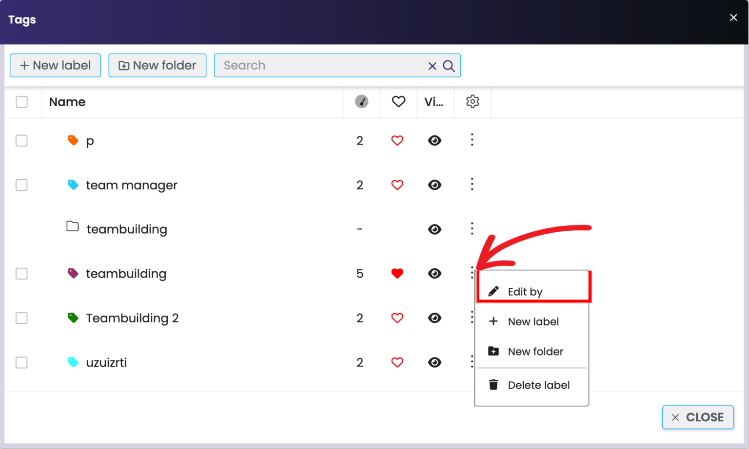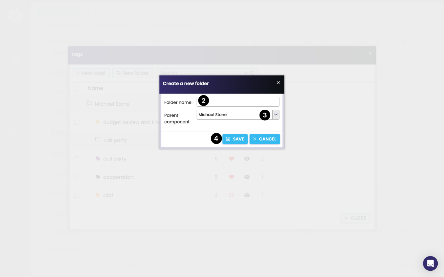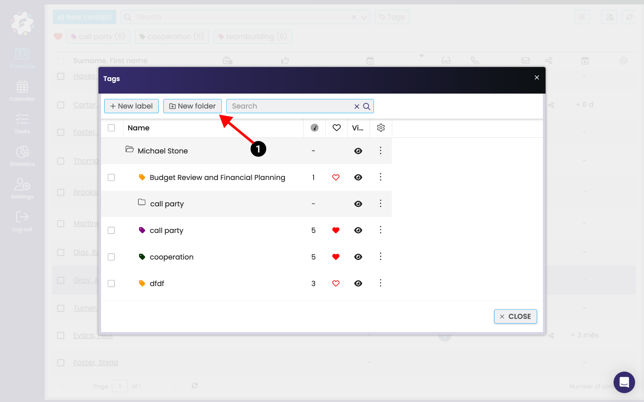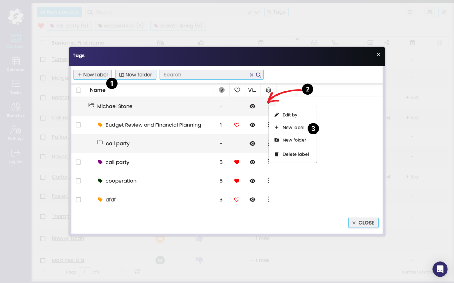 First, click the Tags button on the homepage of the Contacts module. A window for creating and managing labels will appear.