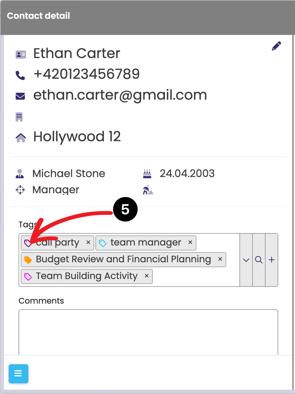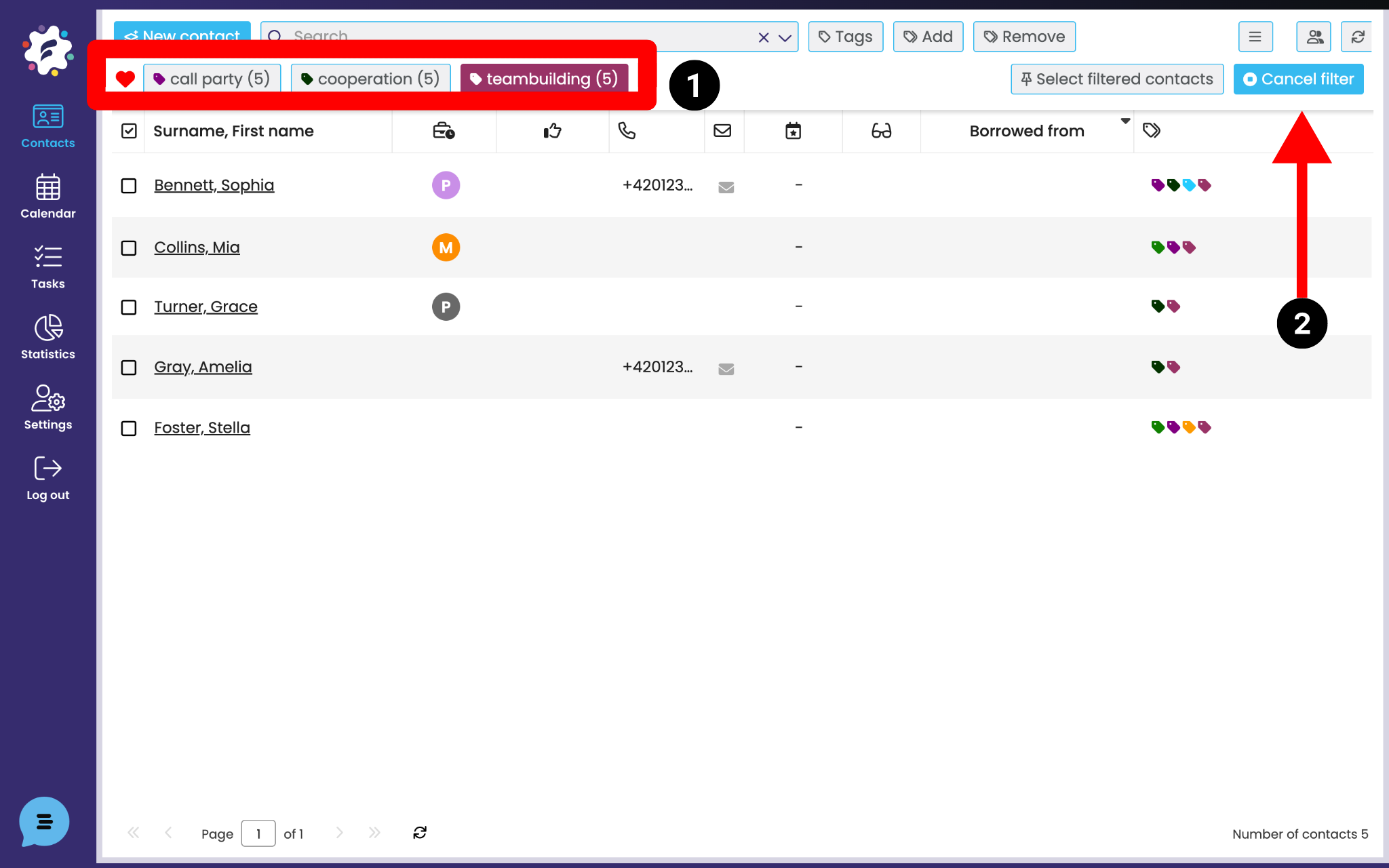 If you want to show contacts from a favorite tag, just click on it. The tag you pick will get highlighted (1). You can select more than one tag at once. If you click the selected tag again, that selection will be removed.