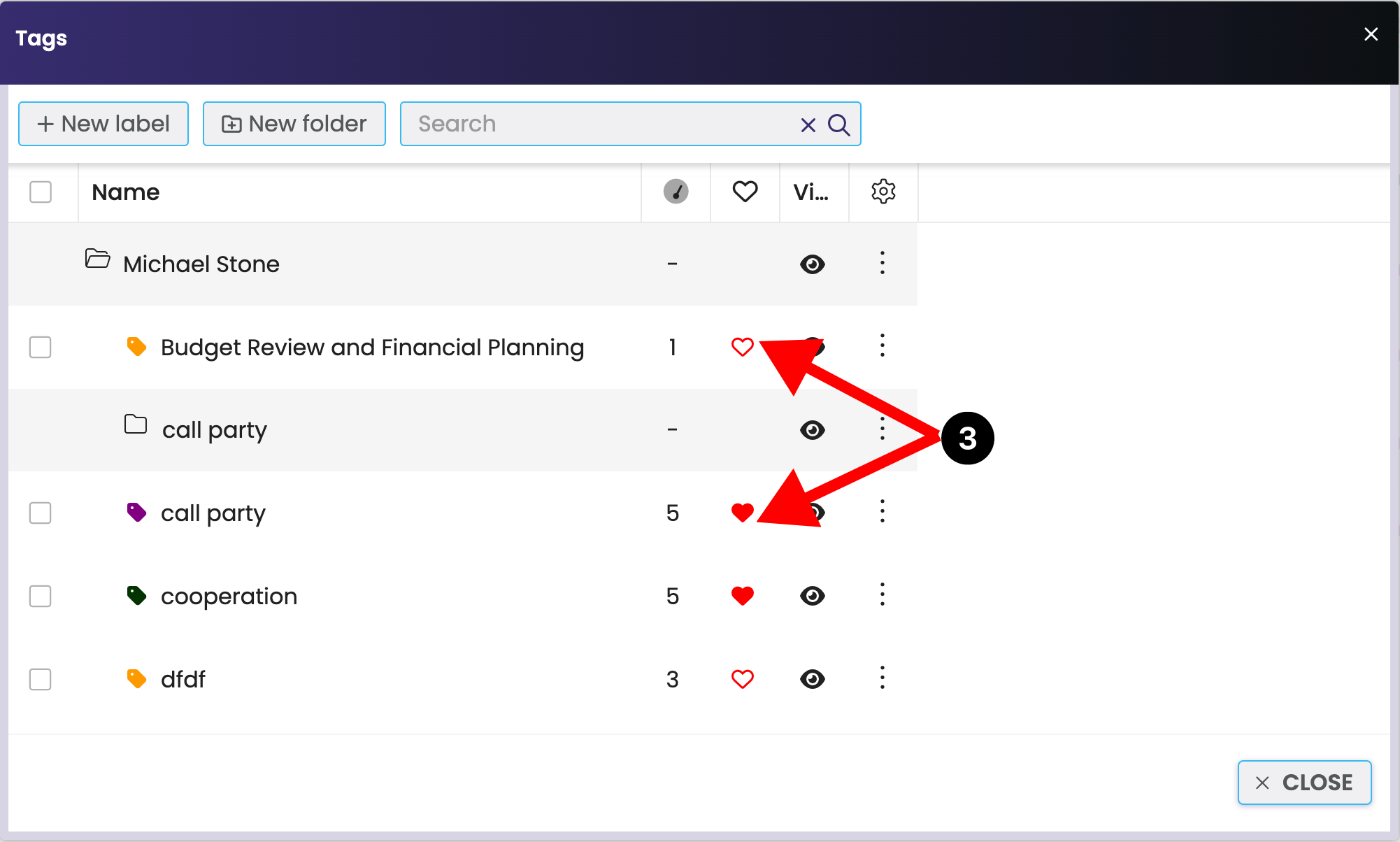 You can add a label to Favorites by opening label editing (Labels) and clicking on the heart (3) next to the label. Once the heart icon is colored in, it means the label is in Favorites.