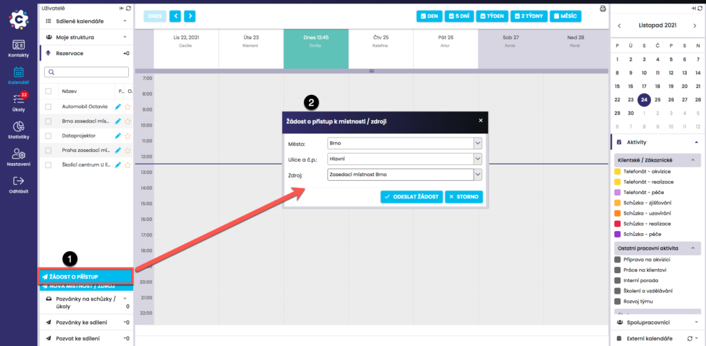 In the system, when entering an activity into the calendar, you can also book a meeting room or, for example, a data projector for training. Coordinate with your team and use the FreshFlow calendar to book your shared resources (rooms, projectors, cars)!