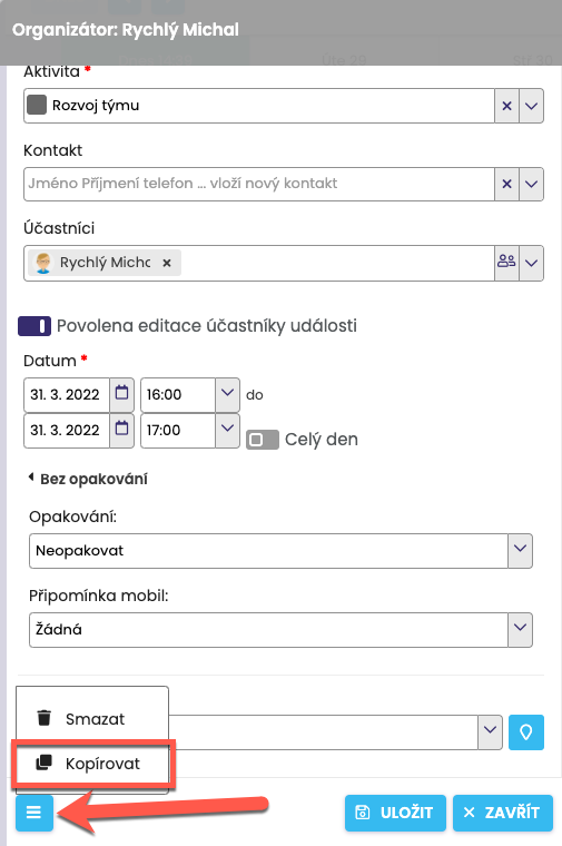 For quick entry of the same activity, you can use the Copy function. In the Calendar module, open the activity and click the icon in the bottom left > Copy. For the newly created activity, check and, if necessary, change the Contact and time, and fill in the Date.