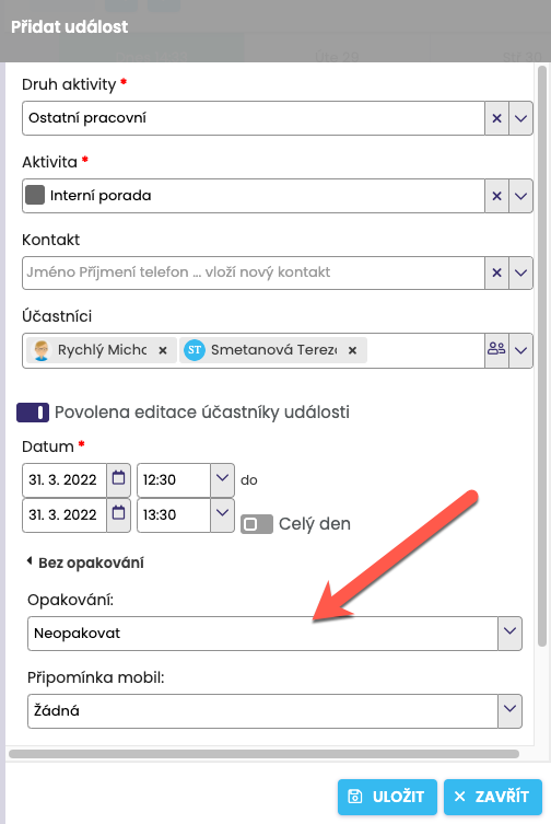 First, define a new event. Select the Type of activity, the Participants who are to take part in this Activity (this can be only you as well), the recurring Activity, for example Meeting, the Date and time, … Once you have defined the activity, click on “No recurrence”, which will expand the option to set the recurrence.