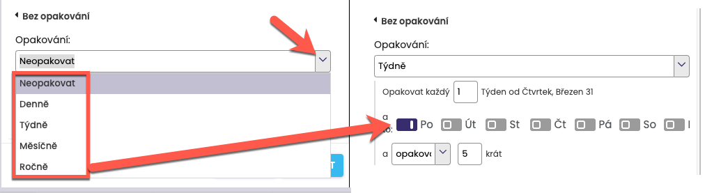 After selecting a recurrence, for example Weekly, you will be asked by the system to specify the frequency in more detail.