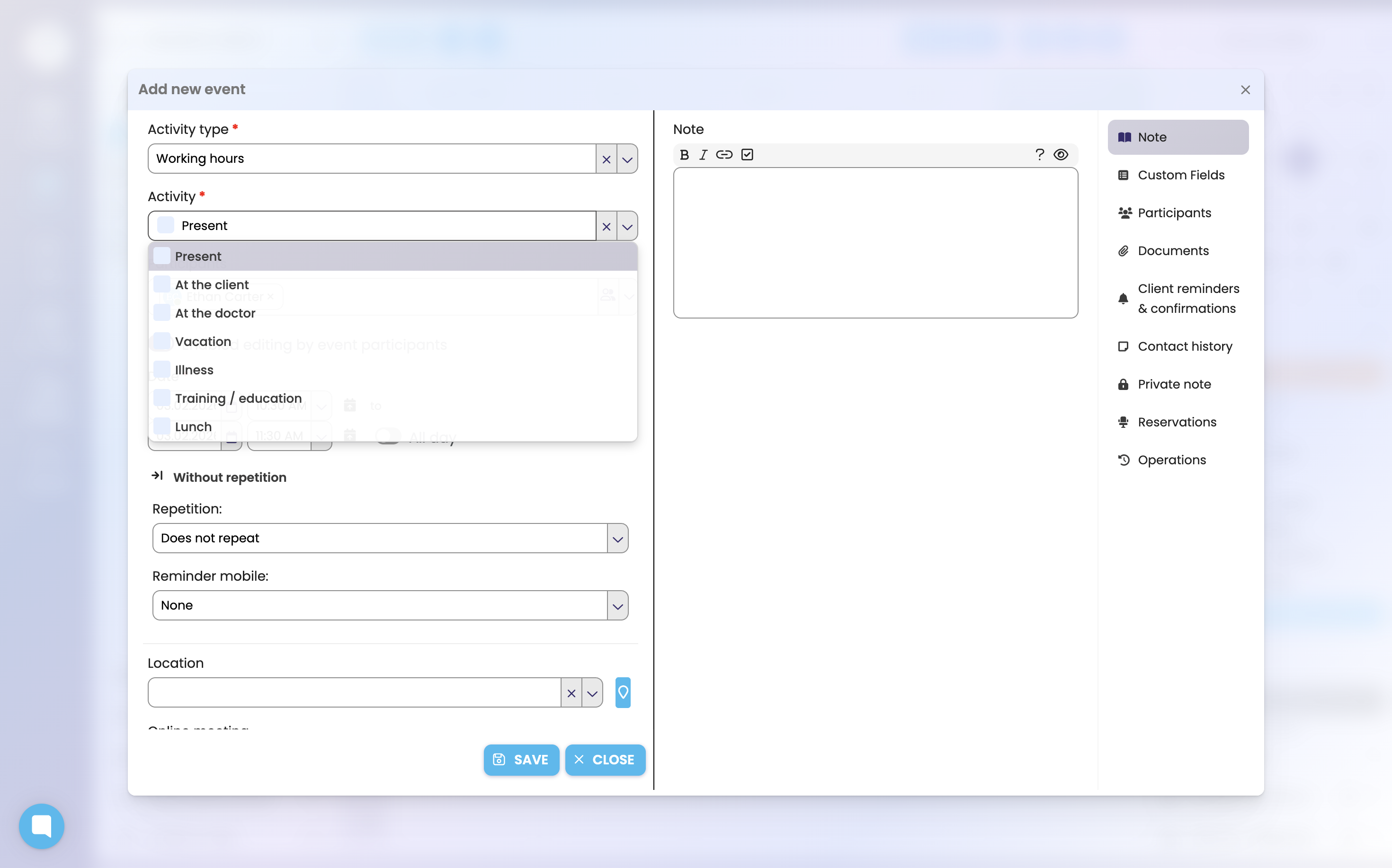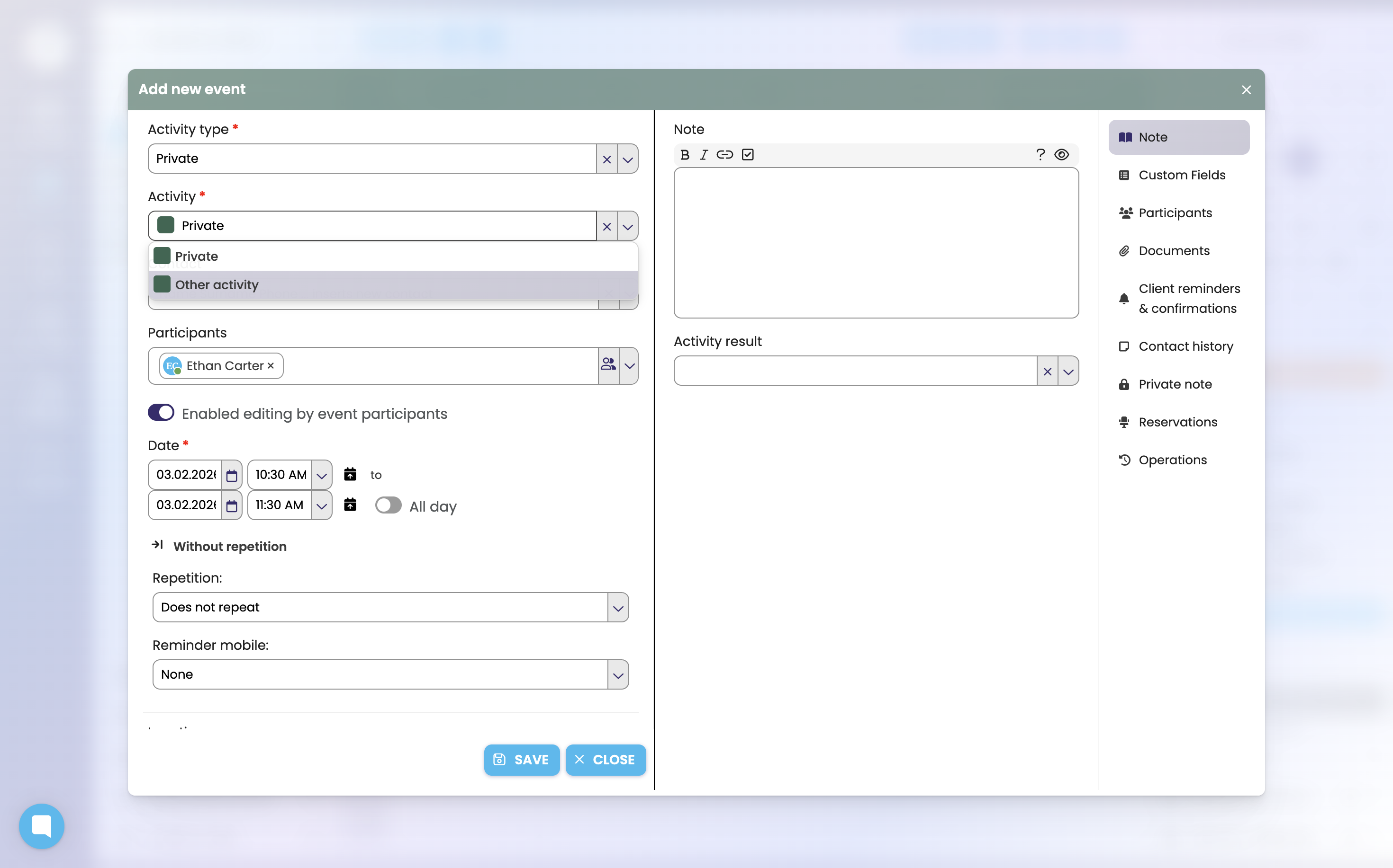 The type of activity Personal offers the options Other activity and Private. If you enter a Private activity, the details of these events are visible in the Calendar only to you, to no one else (not even to your manager). If you add additional Participants and check Allow invitees to edit the activity, the invited participants will then be able to edit the activity.