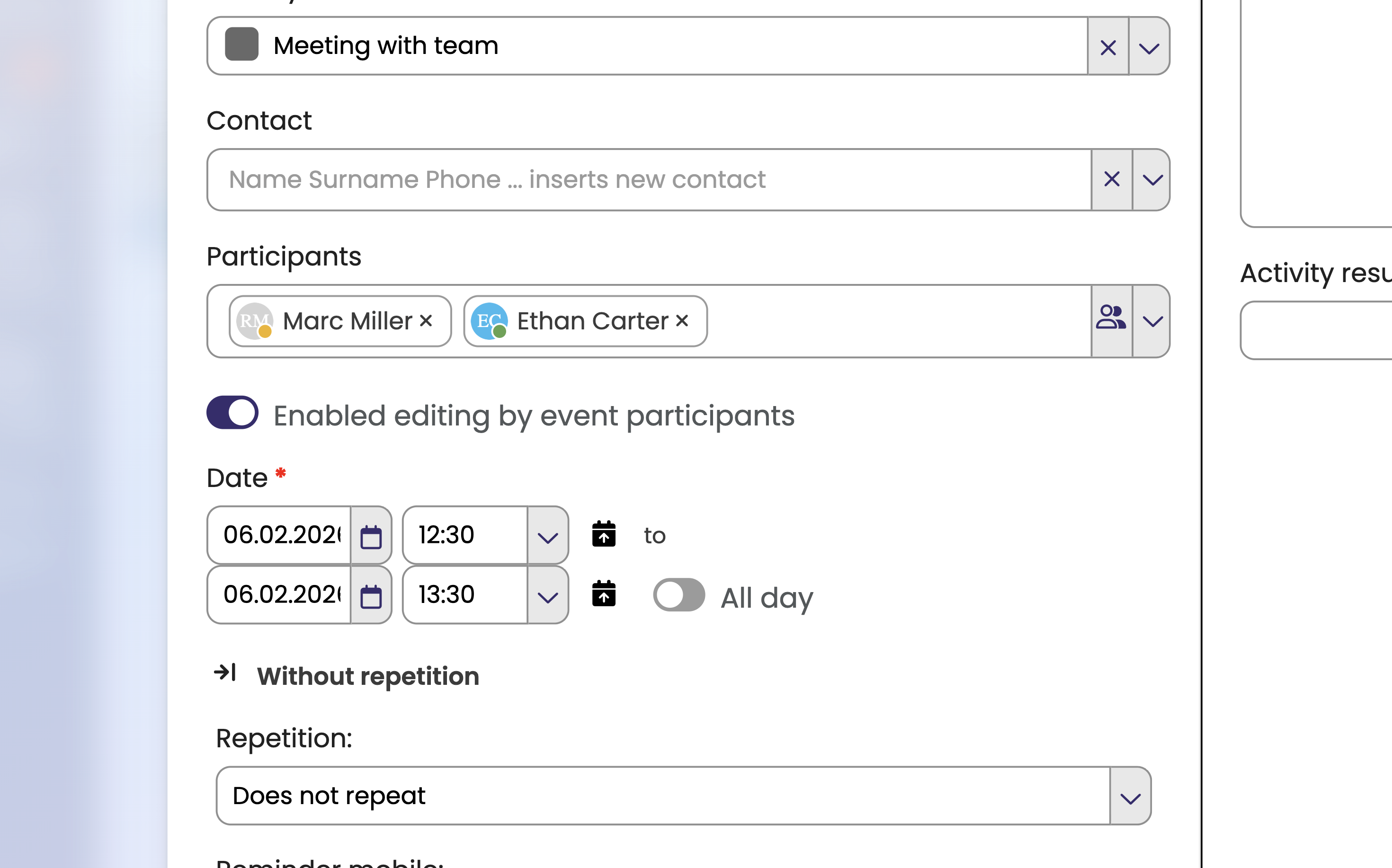 Firstly, enter the Activity. To send an invitation, it is necessary to enter the name or names in Participants. You can add group as well.