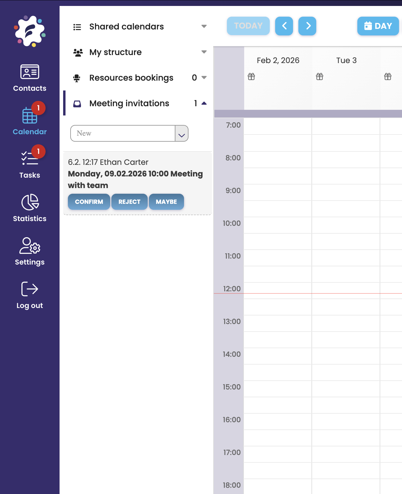 The invitation can be accepted by clicking Confirm, or alternatively rejected. If the event is scheduled sufficiently in advance (more than one day), the “Maybe” option will also be offered.