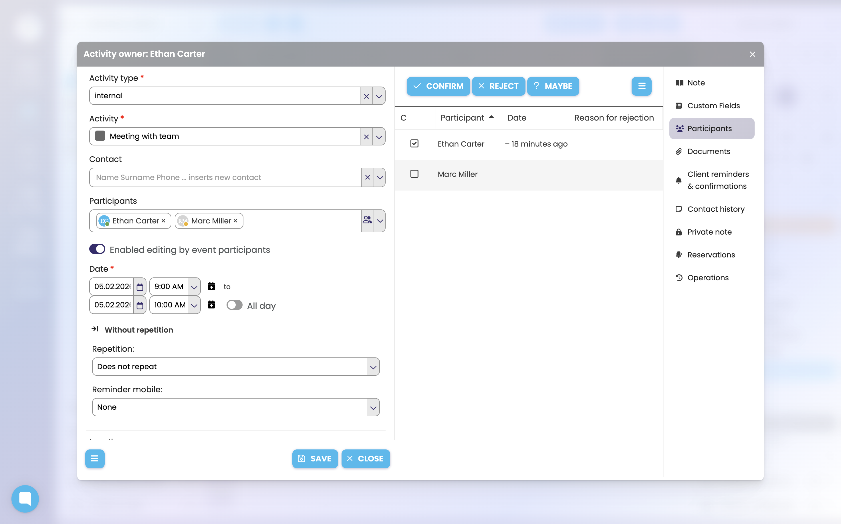 To subsequently decline participation in a meeting, you need to open the relevant Activity in your calendar and click on the group icon next to Participants or, in the right-hand column, on Participants: confirmation / rejection