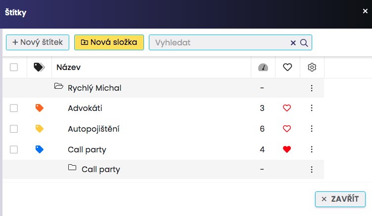 Najprv kliknite na tlačidlo Štítky na úvodnej stránke modulu Kontakty. Zobrazí sa Vám okno na vytváranie a správu štítkov.