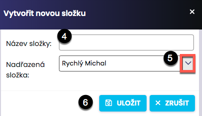Nový priečinok vytvoríte buď kliknutím na Nový priečinok (1) alebo kliknutím pravým tlačidlom myši na tri bodky (2) a následne vo zobrazenom menu na Nový priečinok (3). Otvorí sa nové okno, kde zadáte názov priečinka (4) a jeho umiestnenie v štruktúre (5). Na záver priečinok uložte (6).
